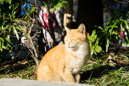 石垣のそばに佇む猫さん。 白いマフラーを巻いた(ような模様で)あったかそうです。